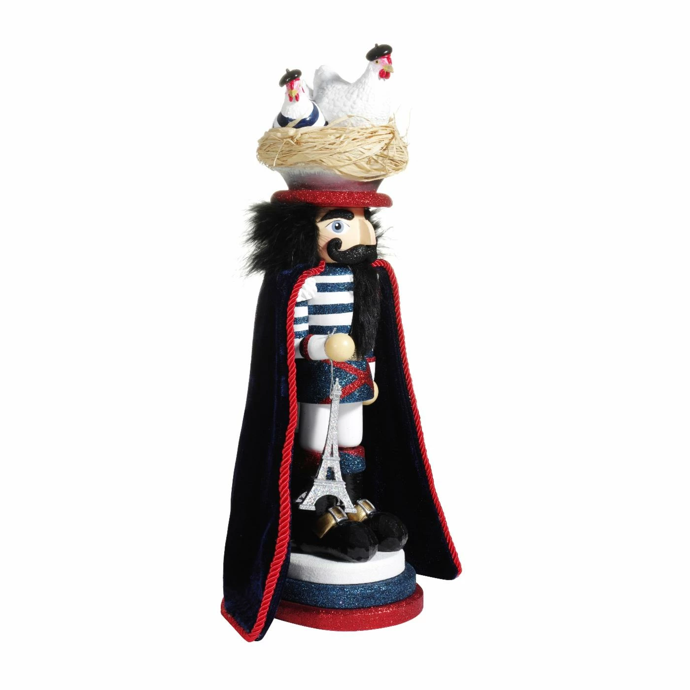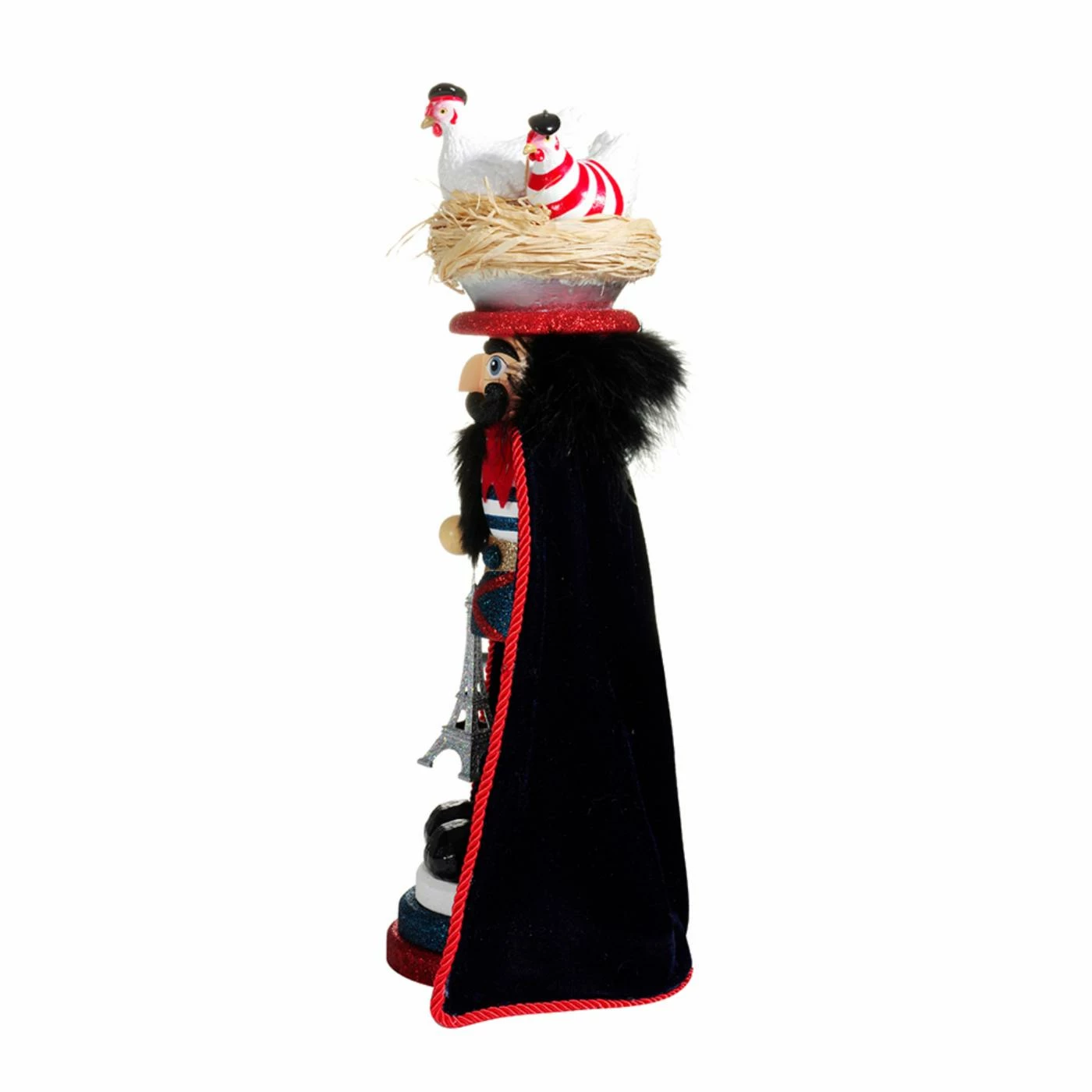 Hollywoodโข Nutcrackers is a whimsical collection of nutcrackers created exclusively for Kurt S. Adler, Inc. and features an assortment of designs that put a unique, vibrant, memorable twist on traditional nutcrackers. This 17.5-Inch Three French Hens Nutcracker features three French hens in a nest. In his hand is an Eiffel Tower ornament. This nutcracker is a stunning addition to any holiday dรฉcor.