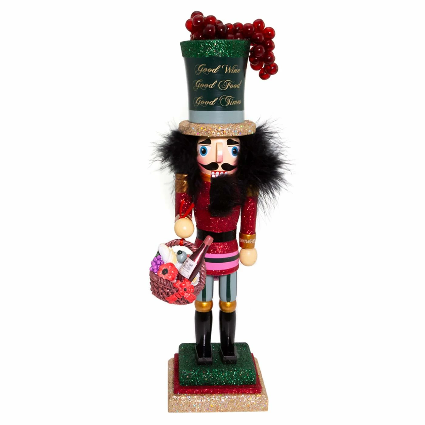 Hollywoodโข Nutcrackers is a whimsical collection of nutcrackers created exclusively for Kurt S. Adler, Inc. and features an assortment of designs that put a unique, vibrant, memorable twist on traditional nutcrackers. This 14-Inch Hollywoodโข Wine Nutcracker features a “Good Wine Good Food Good Times” glittered wine bucket hat with red grapes and is carrying a basket of assorted fruit and a bottle of wine.