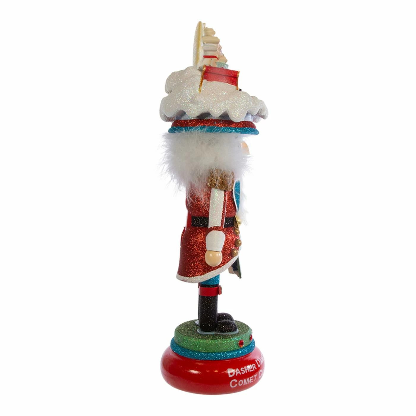 Hollywood Nutcrackers is a whimsical collection of nutcrackers created exclusively for Kurt S. Adler, Inc. and features an assortment of designs that put a unique, vibrant, memorable twist on traditional nutcrackers. This 18-inch nutcracker from Kurt Adler is 5th in the Night Before Christmas series. This nutcracker holds the classic book with a mouse peering over it and wear a glittered hat with 8 tiny reindeer and presents. He stands on a blue and green glittered base with red gemstones, on top a red base with the names of Santa’s 8 reindeer inscribed in white.