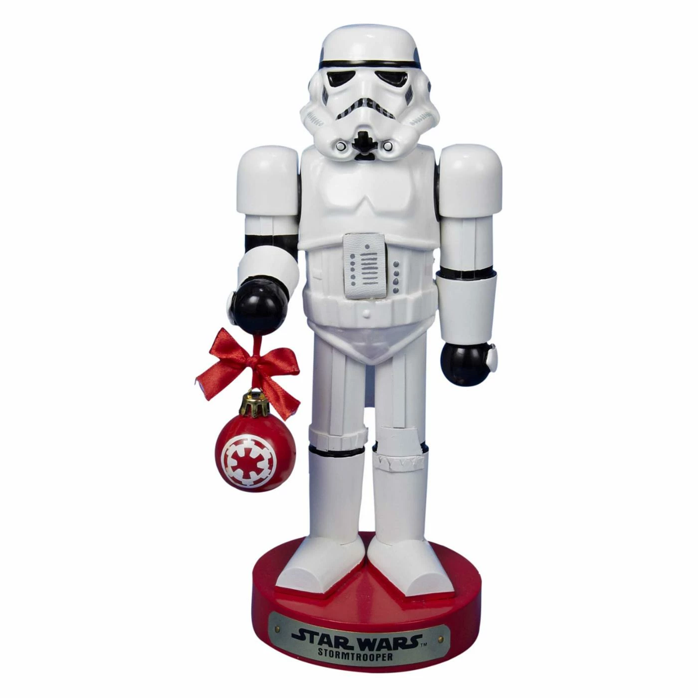The detailed Kurt Adler 12 in. Stormtrooper with Ball Ornament Nutcracker comes holding a festive red ornament. This collectable Stormtrooper nutcracker is officially licensed by Star Wars.