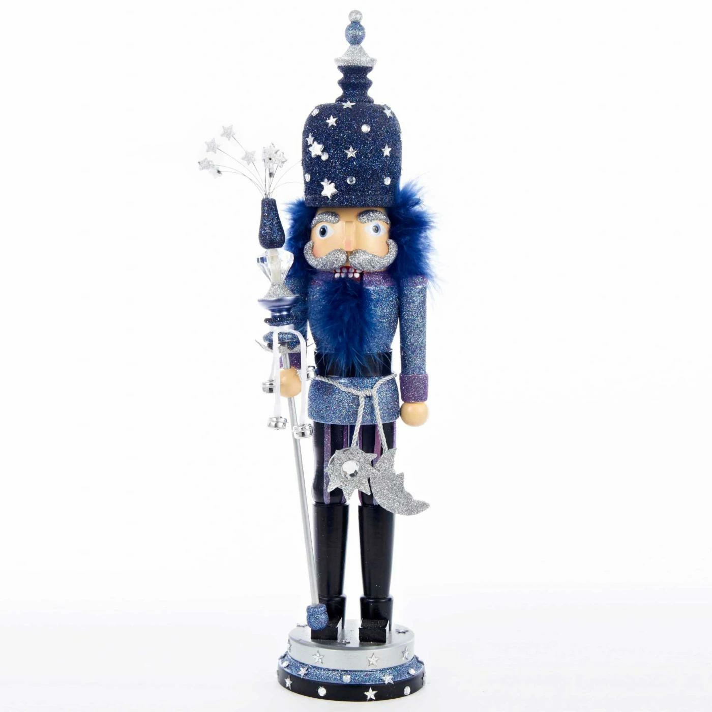 You can wish upon the Kurt Adler 19 in. Hollywood Night Stars Nutcracker to bring endless holiday cheer to your home this season. His vibrant blue suit glitters and is perfectly accented with silver stars. Designed by Holly Adler, this nutcracker is made strong from wood.