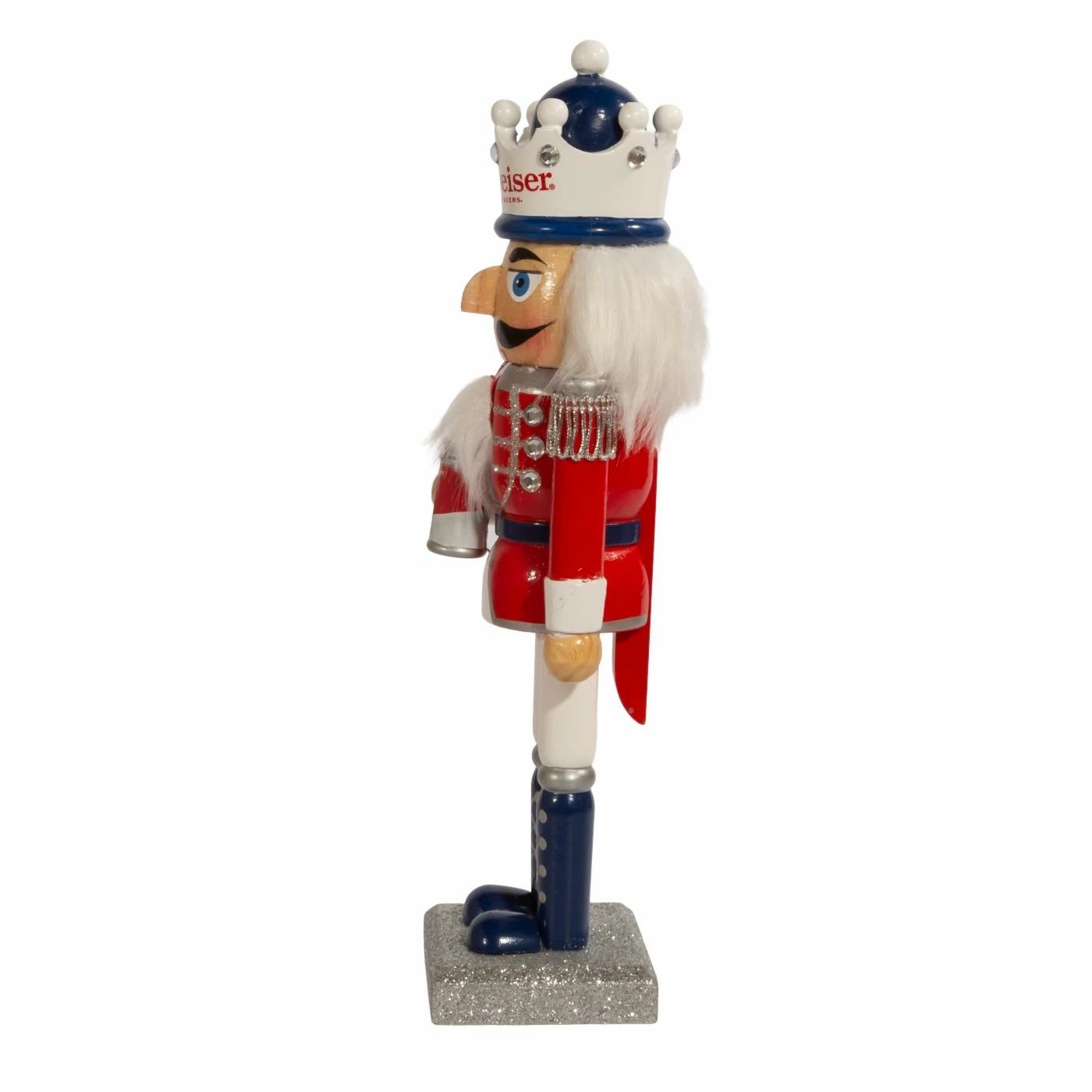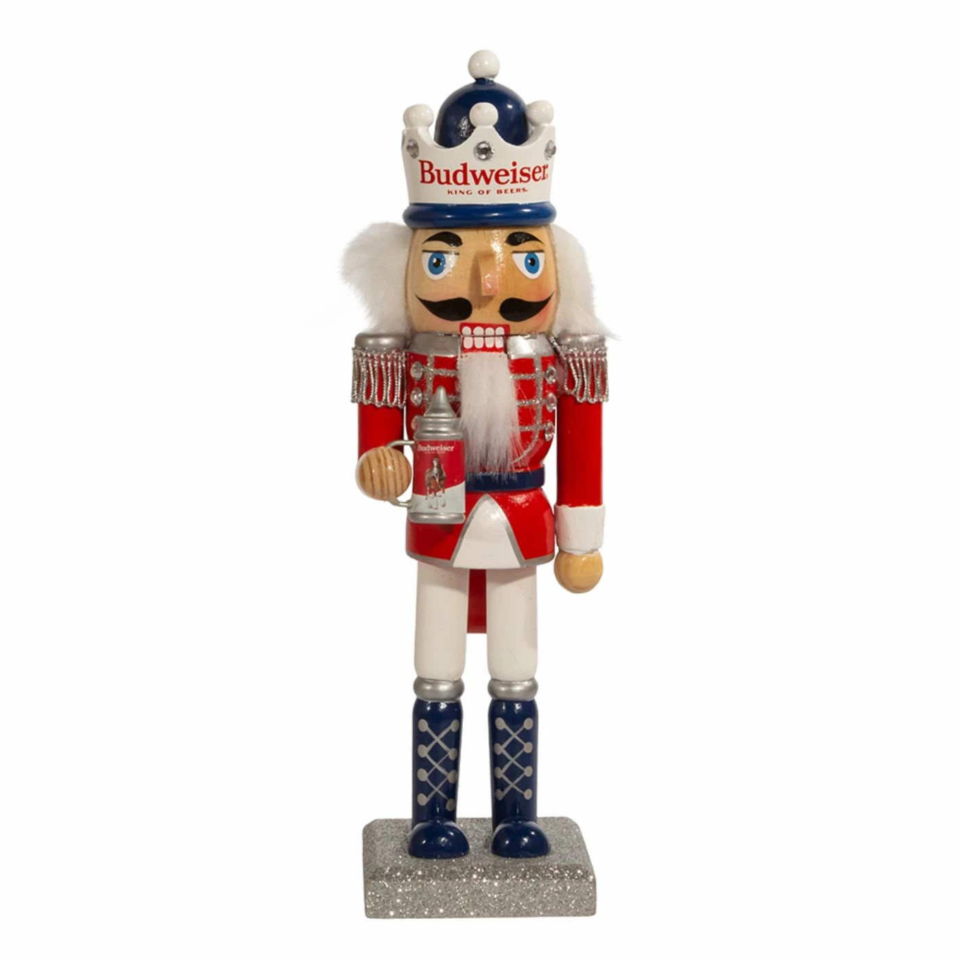 This 10-Inch Budweiser Nutcracker from Kurt Adler is a great addition to your home or holiday dΓ©cor. Standing 10 inches tall, this regal “King of Beer” nutcracker is wearing a Budweiser crown and is holding a Budweiser Clydesdale beer stein in his right hand. This is an officially-licensed Budweiser product.