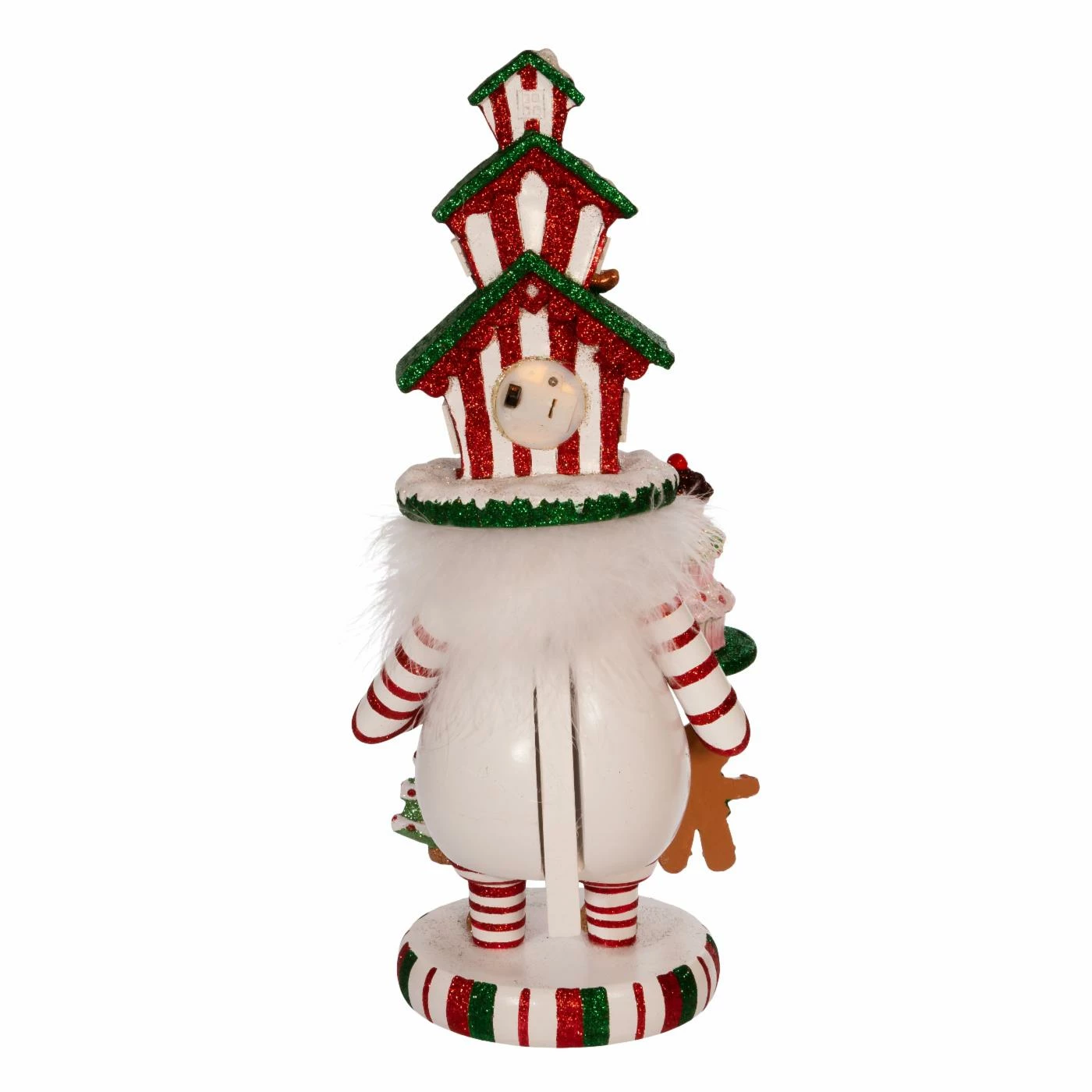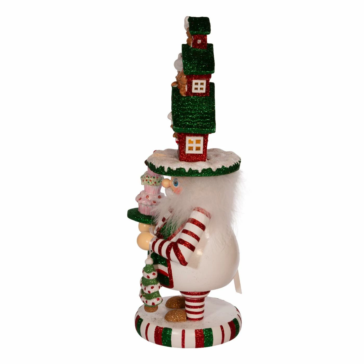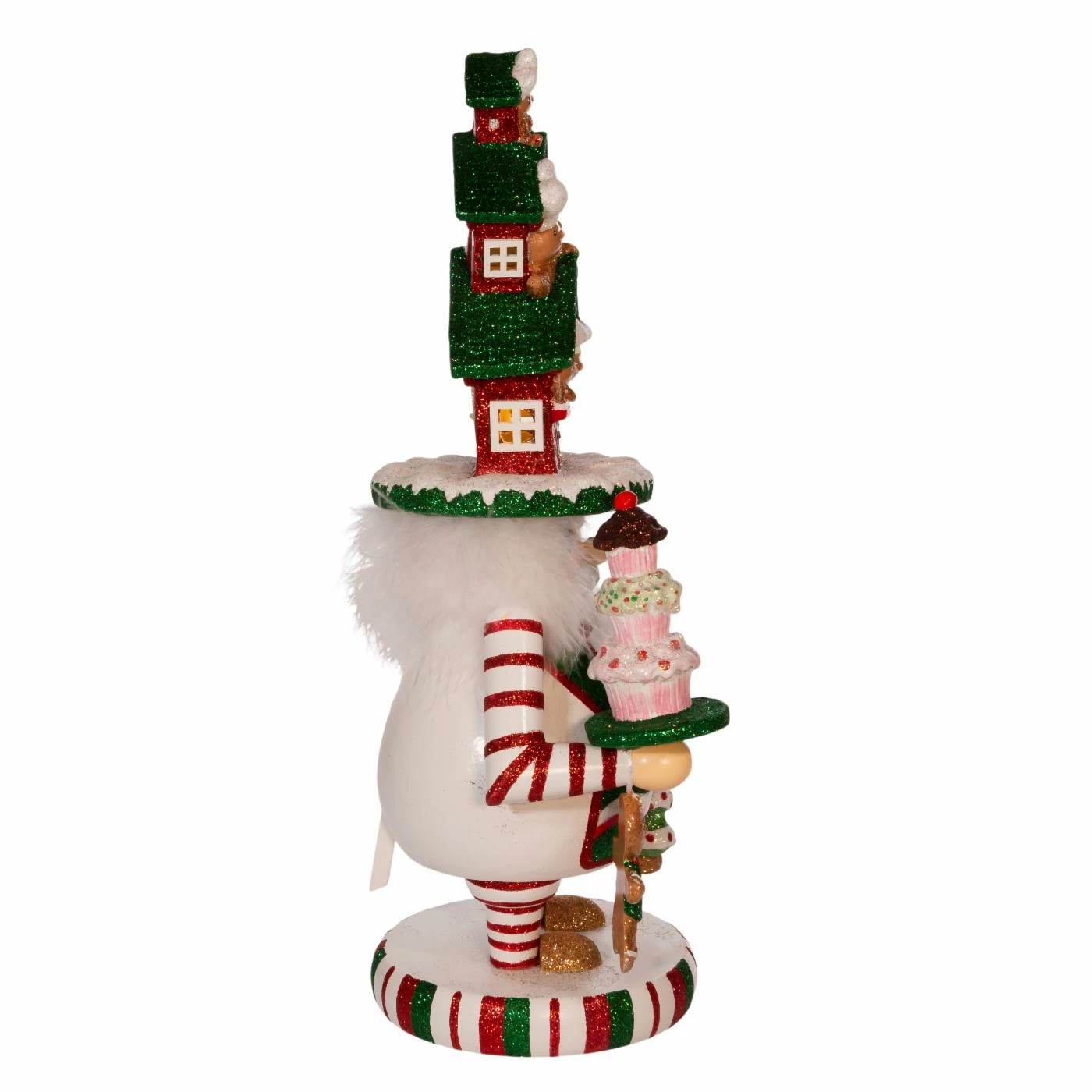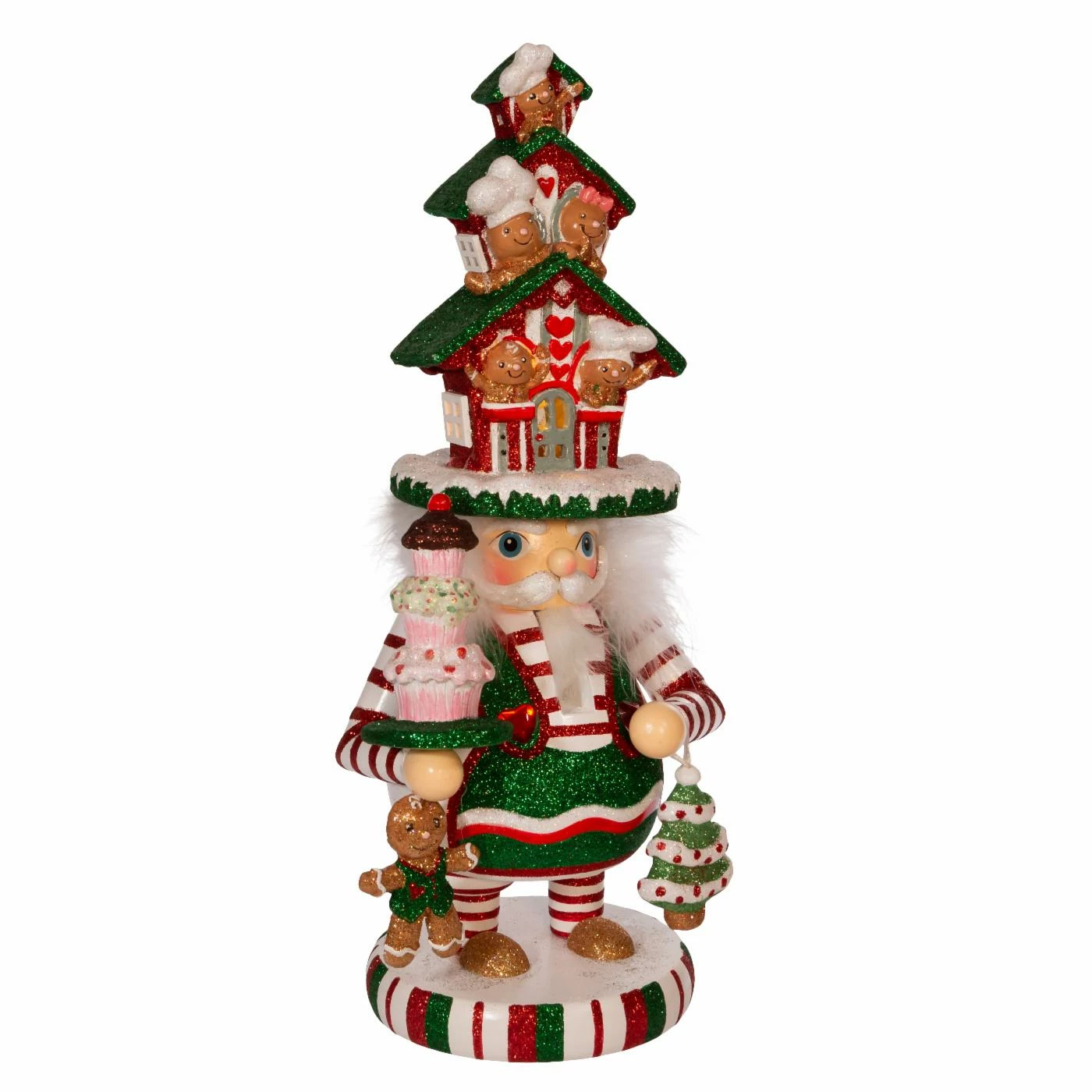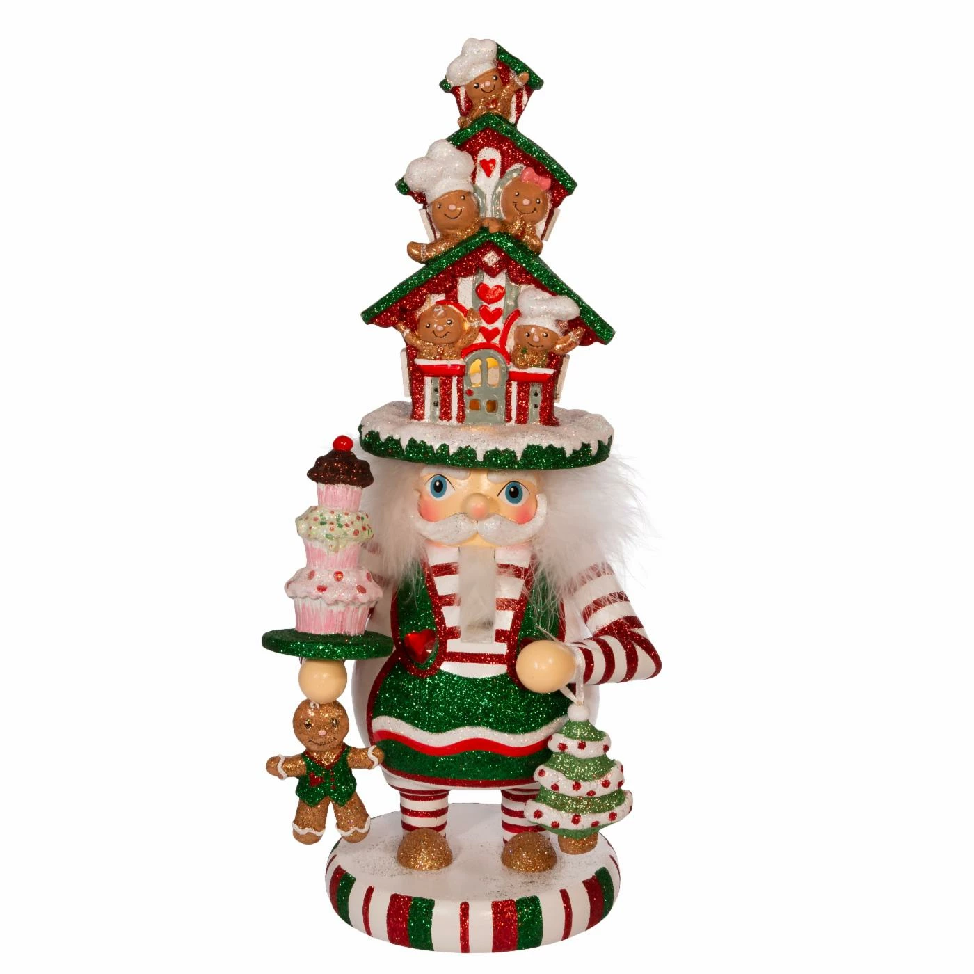 This Kurt S. Adler 15 in. Hollywood LED Gingerbread House Hat Nutcracker features a red, white and green glittered color scheme, a glittered gingerbread man balancing a tray of glittered sweets and a glittered gingerbread house hat that is illuminated from within for a soft glow. Hollywood Nutcrackers is a whimsical collection of nutcrackers created exclusively for Kurt S. Adler, Inc. and features an assortment of designs that put a unique, vibrant, memorable twist on traditional nutcrackers.