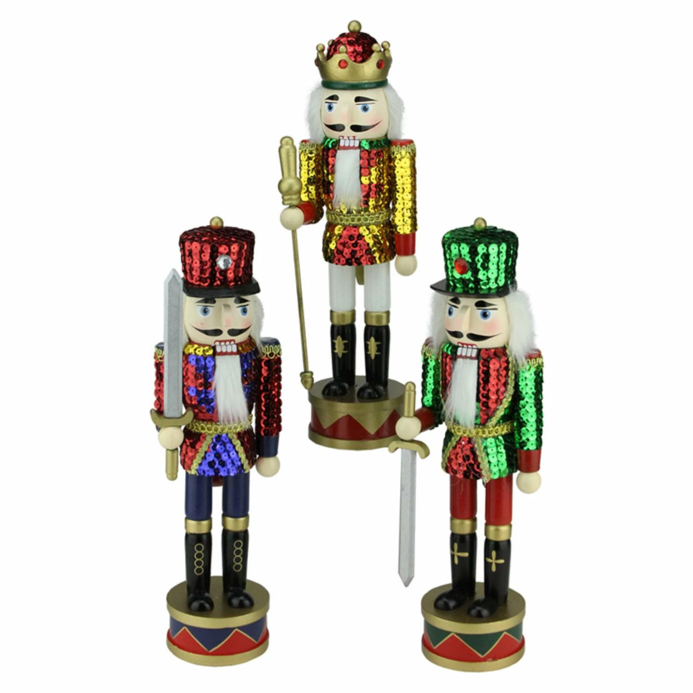 Bring the holiday bling with the Nutcracker Factory 3 Piece Decorative Sequin Jacket Christmas Nutcracker Set, featuring a set of three nutcracker figures wearing shimmering sequin jackets in colors of gold, blue, red, and green. This delightful set is made of wood and each piece is holding a sword or scepter for an authentic look as they stand on a drum-style base.